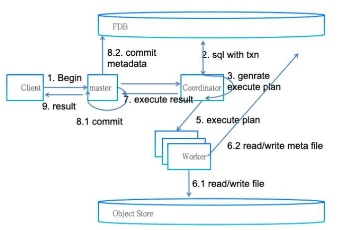 8. The Master performs transaction commit, first checking for write-write conflicts before committing the FDB metadata. Here, we divide FDB metadata into temp space and work space. Writes in step 6 are made to the temp space within the transaction's own space. During commit, the data is "moved" to work space, ensuring atomicity through FDB transactions.
