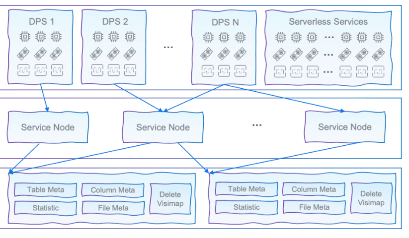 Meta Service: This service is responsible for the abstraction of tables, columns, files, and statistics. It supports MVCC capabilities and provides a consistent metadata view. It encapsulates KV structures into table APIs, facilitating access by multiple DPS or application services.