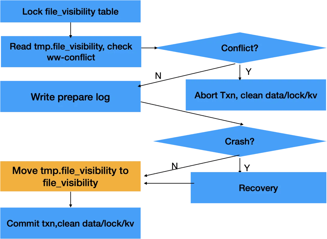 Lock file_visibility table: We apply a level-4 lock on the auxiliary table of the modified table. To prevent other transactions from performing conflict detection on this table during ww-conflict, we lock the auxiliary table (not the data table) at the start of ww-conflict. This lock allows only selects on the auxiliary table and blocks updates/deletes/inserts until the transaction ends and the lock is released. Since it is a level-4 lock on the auxiliary table, it does not block other transactions' update/delete/insert operations (which, unlike traditional PG methods, do not acquire level-2 locks but only level-1 locks, as they do not modify the workspace data). It only blocks other transactions' prepare/commit and conflict detection operations.